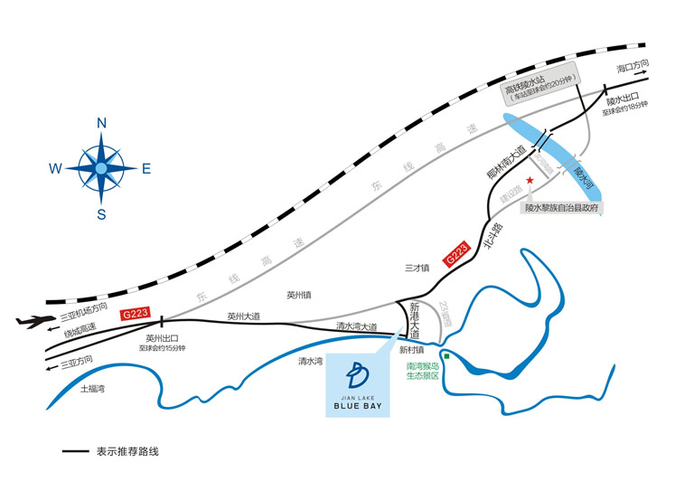 海南环岛G98高速往海口方向,由英州出口下高速。沿清水湾大道直行,途经雅居乐和阿罗哈社区后,直行6公里到达鉴湖•蓝湾高尔夫球会。