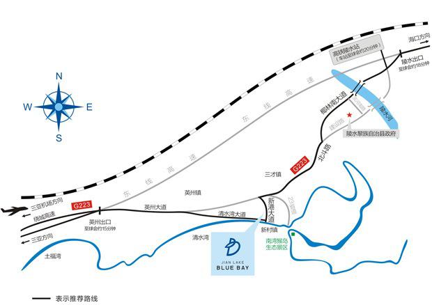 从三亚出发→G98海口方向→英州出口下高速→清水湾大道→阿罗哈社区路口直行6公里→到达绿城蓝湾小镇