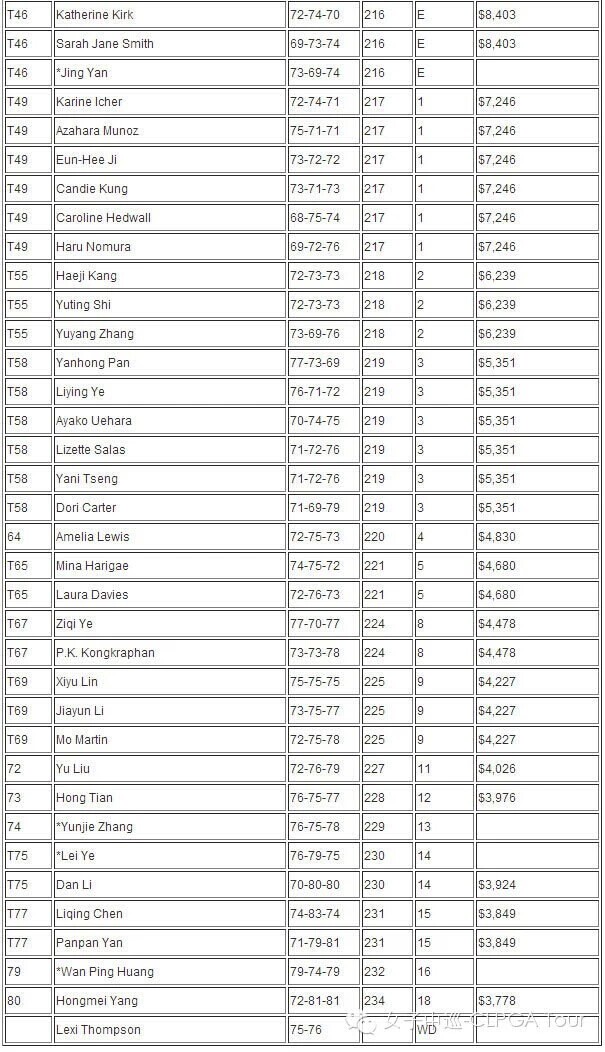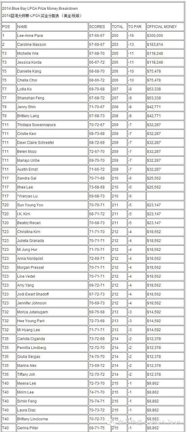 2014蓝湾大师赛-LPGA奖金分配表
