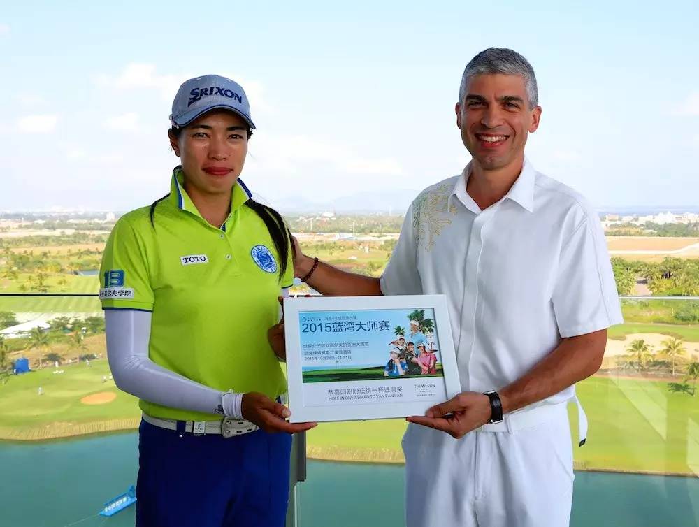北京时间10月29日,每年的蓝湾大师赛都有幸运女神降临!今天,山东青岛球员闫盼盼,在蓝湾大师赛第一轮第17洞(136码,Par 3),用8号铁打出一杆进洞,赢得蓝湾绿城威斯汀度假酒店七晚焕彩海景套房豪华入住体验。