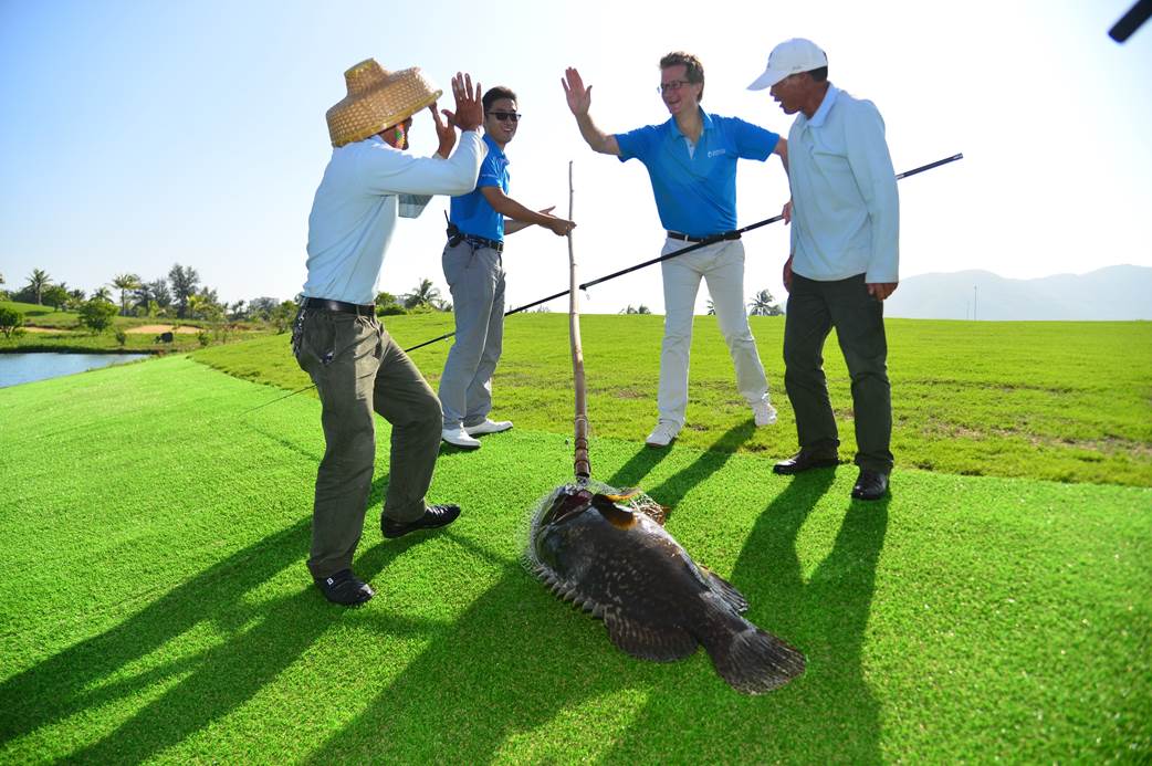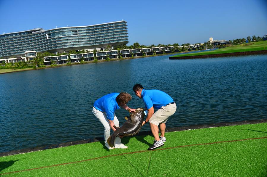 蓝湾大师赛第二轮开赛前,球会工作人员在18号洞景观湖集众人之力制服了一条体型庞大的鱼,大家都十分好奇这是在干什么?