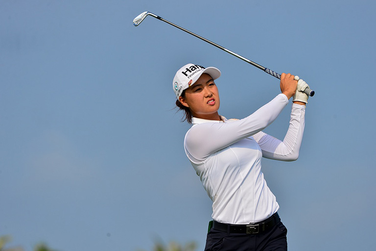 六号洞6英尺的保帕推,是她全天的转折点。七号洞,141码,8号铁差点一杆进洞,抓到死鸟之后,启动开挂模式。之后六个洞,她抓到5只小鸟,与李旻智并列领先。