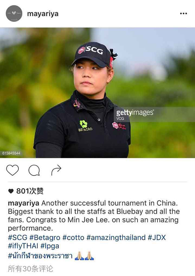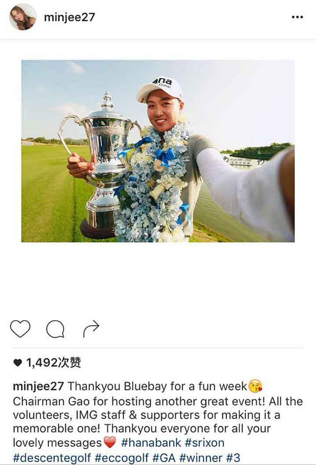 冠军李旻智(Minjee Lee)发图文感谢蓝湾带来的欢乐与荣耀