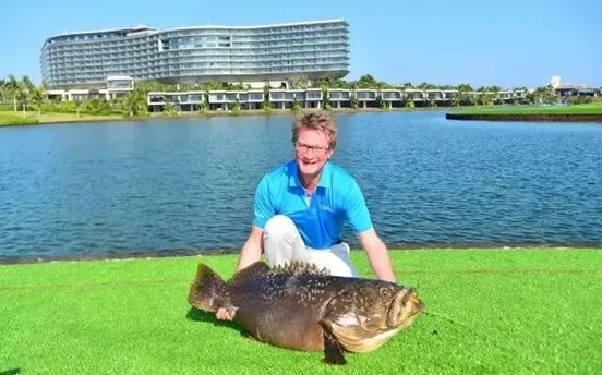 不一会儿,水面上的浮标动了,他觉得手上传来很大的拉力,整个鱼竿竟几乎弯成了新月形,有鱼上钩了!他赶快拉起鱼竿收渔线,在众人的帮助下将猎物拉到岸边最终搬了上来。定睛一看,眼前的景象令他大吃一惊:第一钩居然就钓上来一条将近70斤重、素有『海中珍品』之称的『石斑鱼之王』,龙胆!这让他都不敢相信。这种『传奇经历』,恐怕只会在蓝湾球场才有吧。